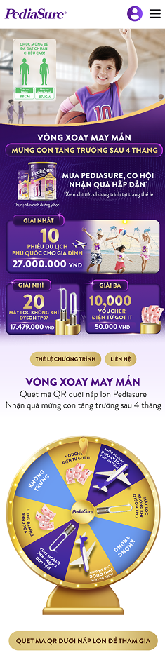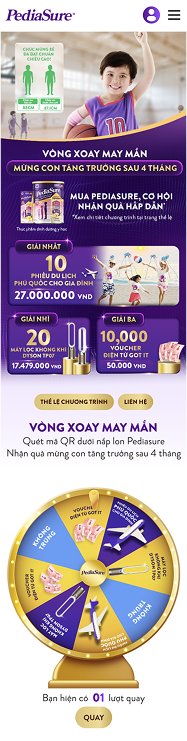 - Điện thoại có kết nối internet sẽ được vào trang web https://pediasure.abbottvietnam.com.vn/4-thang-cai-thien-tang-truong/lucky-draw để tham gia chương trình. Mã QR trên các vật phẩm trưng bày có tại cửa hàng như khung treo quảng báo, băng rôn dùng để quét để tham gia chương trình không phải là mã QR ưu đãi được phủ lớp tráng bạc trên nắp vỏ lon để tham gia quay số
