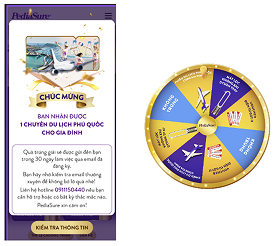 - Nếu vòng quay dừng lại ở ô có nội dung “PHIẾU DU LỊCH PHÚ QUỐC CHO GIA ĐÌNH”, hệ thống sẽ ngay lập tức hiện thông báo. CHÚC MỪNG BẠN NHẬN ĐƯỢC “1 PHIẾU DU LỊCH PHÚ QUỐC CHO GIA ĐÌNH”. Quà sẽ được gửi đến bạn trong khoảng thời gian chậm nhất 30 ngày kể từ ngày quay số xác định trúng thưởng. Khách hàng nhận được giải Phiếu du lịch Phú Quốc dành cho gia đình