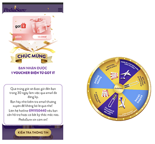 - Nếu vòng quay dừng lại ở ô có nội dung “VOUCHER ĐIỆN TỬ GOT IT”, hệ thống sẽ hiện thông báo. CHÚC MỪNG BẠN NHẬN ĐƯỢC 1 VOUCHER ĐIỆN TỬ GOT IT”. Quà sẽ được gửi đến bạn trong khoảng thời gian chậm nhất là 30 ngày làm việc”, khách hàng sẽ trúng giải thưởng Phiếu quà tặng điện tử Got It
